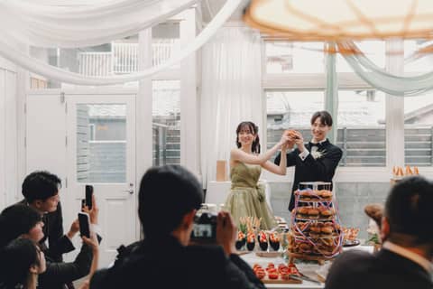 二部は、会社の同僚やご友人を招いてカジュアルパーティー。自由に行き来して楽しめる、アットホームで温かい時間